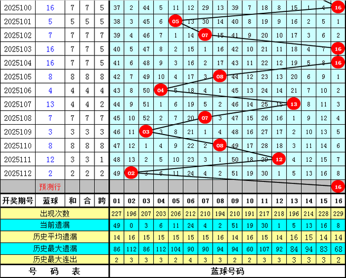 蓝球5码推荐:01、03、07、12、16